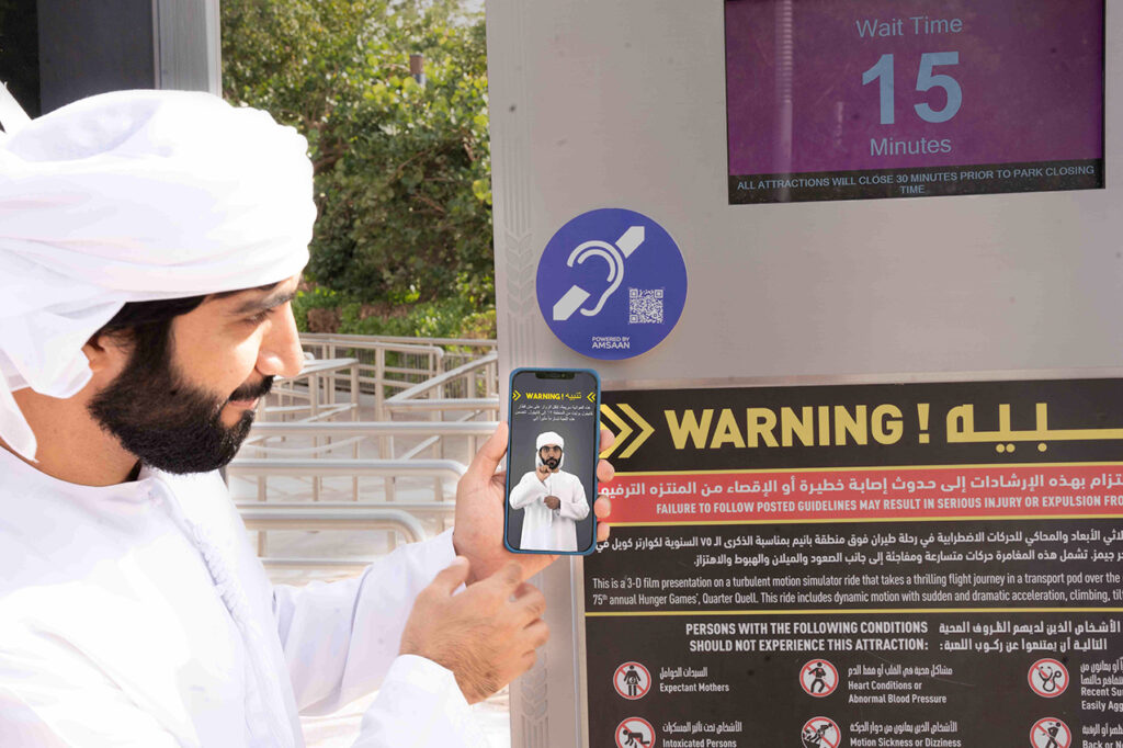 Traditional methods of communication, such as printed signs or verbal instructions, are challenging for the local Deaf community and can lead to misunderstandings. This initiative introduces on-demand Emirati sign language for ride descriptions, safety guidelines, and park instructions, allowing local Deaf visitors to easily access essential information by scanning strategically placed QR codes linked to Amsaan’s dedicated platform with Emirati sign language videos. Deaf visitors will be able to navigate MOTIONGATE™ Dubai independently and make informed decisions about attractions, enabling a more self-reliant, barrier-free, and enjoyable experience. This project is not static; based on feedback from the Deaf community and park visitors, there will be continuous enhancement of these Deaf-friendly features.