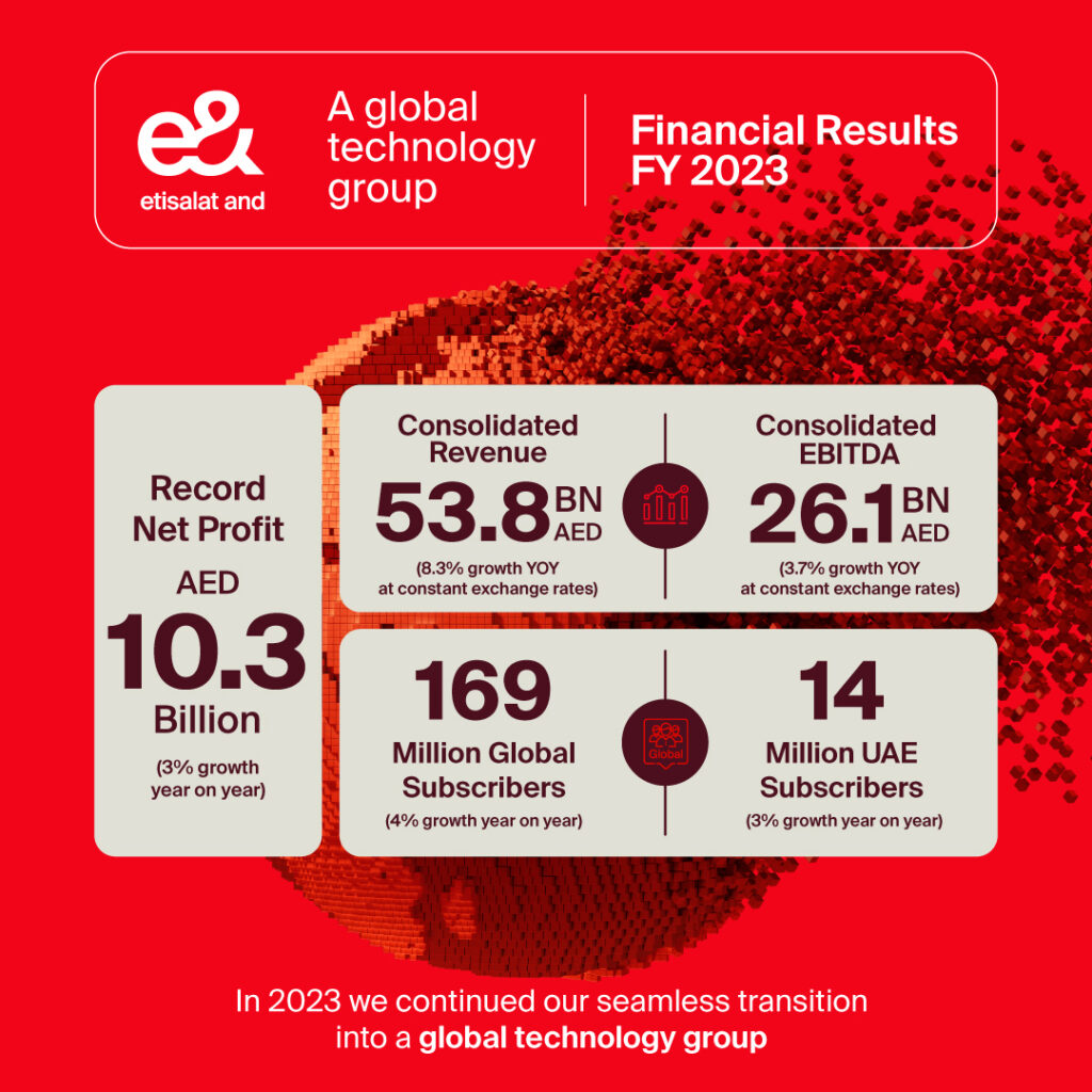 Abu Dhabi, 21 February 2024 – e& announced its consolidated financial results for fiscal year 2023 reporting a record consolidated net profit of AED 10.3 billion, a growth of 3 per cent year-over-year.